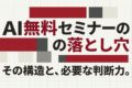 最近、「AI無料セミナー」が急増しています。一見すると学習機会に見えますが、実務視点で分解すると、その多くは明確な構造を持っています。結論から言えば、これは教育コンテンツではなく販売導線として設計されたコンテンツです。無料セミナーの本質多く...