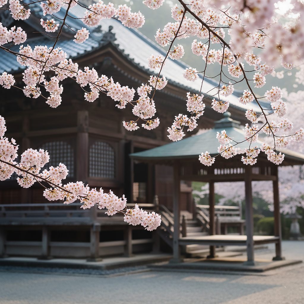 7点目は、日本の原風景とも言える、桜と伝統建築の組み合わせです。満開の桜の枝越しに、古い木造の寺院や東屋がぼんやりと見えます。深く落ち着いた色の木材と、淡いピンク色の桜が、日本らしい和の美しさを奏でています。