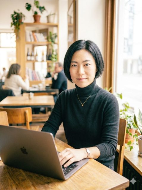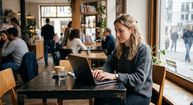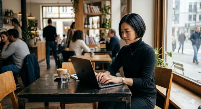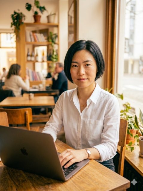 30代前半の女性が、午前中の落ち着いたカフェでノートパソコンを操作している。