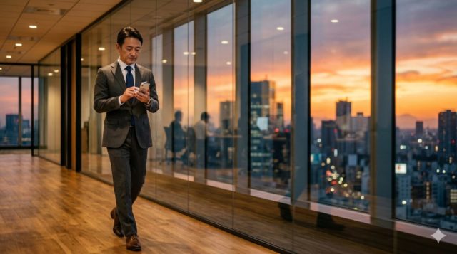 40代の男性ビジネスマンが、夕方のオフィスでスマートフォンを見ながら歩いている。