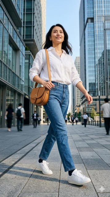 白シャツとデニム、肩掛けバッグ。