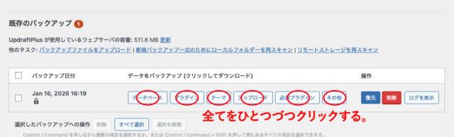 1. 全てのボタンをクリックする 「バックアップデータ」の欄にある、以下のボタンを一つずつクリック。