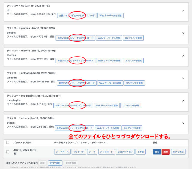 - 「ダウンロード」を忘れずに: サーバー移転の場合、新サーバーへデータを手動で渡す必要があるため、PCへのダウンロードは必須作業。