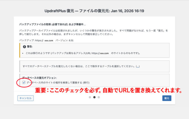 データベースの復元オプションに必ずチェックをいれる。新しいサイトへのURLの置き換えが必須。