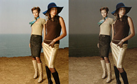 下に、ストレートにプリントした写真(左)と、画像処理をした写真(右)を掲載しましたので、見比べて下さい。モニタで見るとわかりづらいかもしれないけど、背景の空と海を少し暗くして、さらに青みを取ってる。そして、彩度(色の鮮やかさ)を低くして、仕上げに粒子を荒らす。たったそれだけのことだよ。