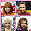 モデルの女の子がヘアメイクでこんなに変わるということを、before(左上)/after(その他)の写真で見比べて見よう。今回は流行のウイッグ、つけ毛を使っていろんな髪型にしているんだ。専門のショップに行くと、色や形が違ういろんなものを見つかるよ。
