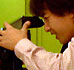 しかしあくまでファッション写真、部屋カタログそのままではつまらなくなってしまうので、ライティングを工夫してる。部屋全体を明るくするために、天井に向けてストロボをセットして、カメラ側からはリング・ライトという特殊なストロボを使った。これは下の写真で見てもらうとわかるけど、カメラのレンズの前にセットし、その真ん中からレンズが覗くようになってる。ちょうどカメラのレンズの前にドーナッツ型の蛍光灯をセットしたような感じといえばわかってもらえるかな?